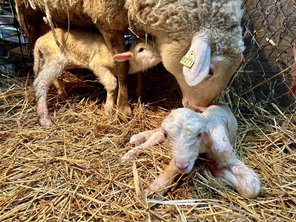 The lambs are born around Valentines day and live with their mothers. We have two flocks of sheep, one for the dairy and one for the sheep dog training center.